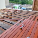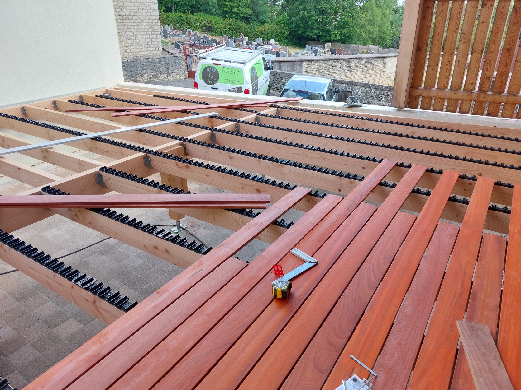 - Structure bois : Application d’une bande d’étanchéité sur les lambourdes ou les solives pour les protéger des eaux de pluie, maintien d’une circulation d’air optimale pour éviter le pourrissement.